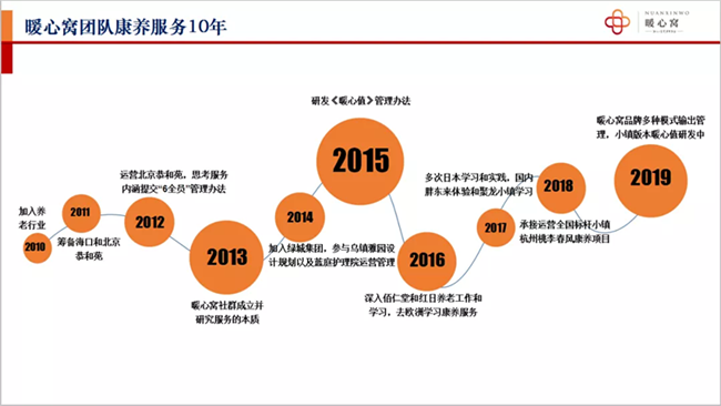 上海暖心窝养老服务有限公司2010年加入养老行业,经过多年的研究、实践,逐渐成长为国内领先的养老服务品牌机构,曾荣获品牌中国“新中国70年70系列中国养老行业品牌新锐单位”“暖心窝创始人关延斌荣获行业品牌创新人物”荣誉称号。暖心窝核心团队汇集了健康管理、中医理疗、日间照料、运动康复、长期照护、居家服务等多种类别的康养服务项目,包括恭和苑、绿城集团桃李春风、佰仁堂、红日、绿城·乌镇雅园等多个项目。