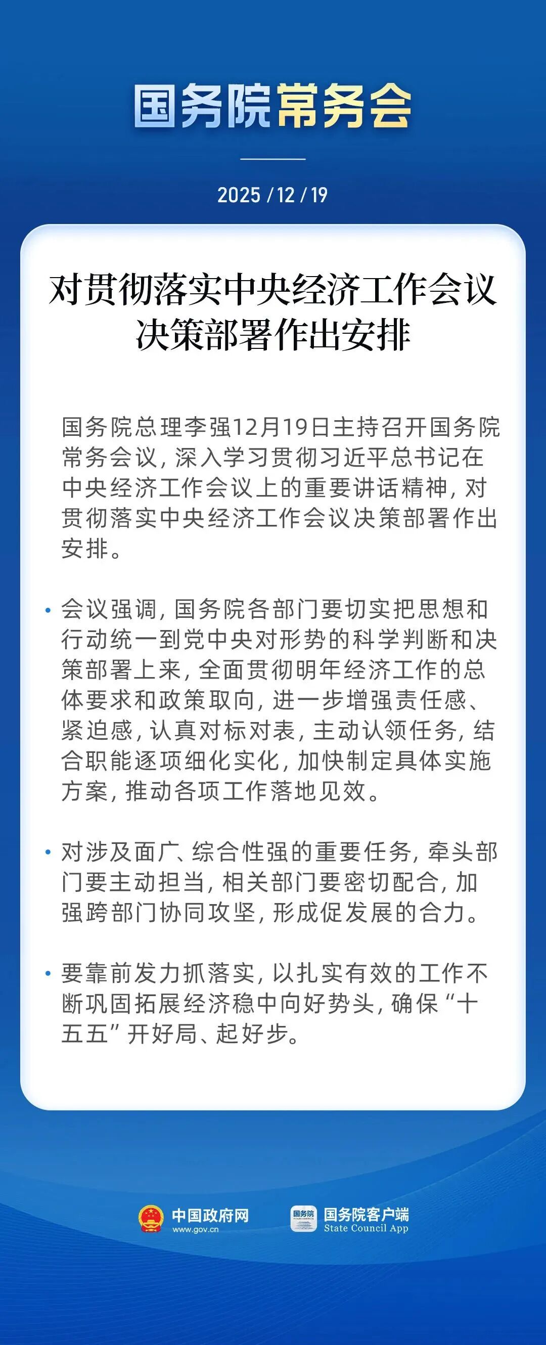国务院常务会:对贯彻落实中央经济工作会议决策部署作出安排