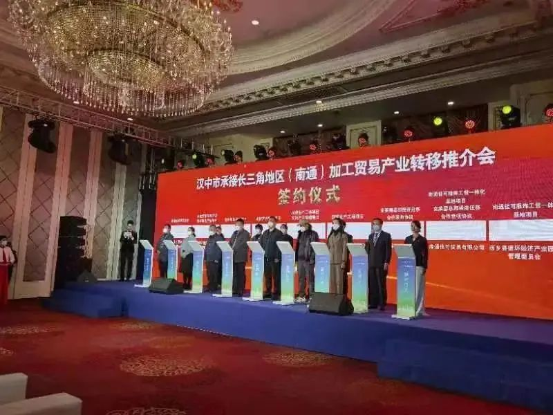 12月23日:由汉中市商务局主办,汉中市工商联、南通市工商联、江苏省苏商发展促进会协办的汉中市承接长三角地区加工贸易产业转移推介会在南通举办。会上签订项目10个,总投资17.07亿元。